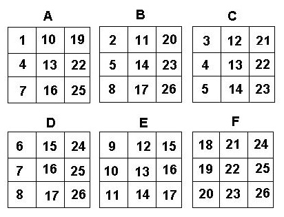 As the leader, you say "Pick a whole number from 1 to 31 and don't tell me what it is. I will tell you your number. Is your number on card A? Is your number on card B? " and so on through card E. If the person says their number is on cards A, B and D, for example, you add the numbers in the upper left hand corner of those cards A, B and D, or 1 + 2 + 8 = 11 which is the person's number! Now try this on your friends, parents and teachers!